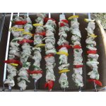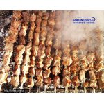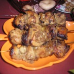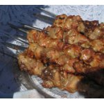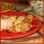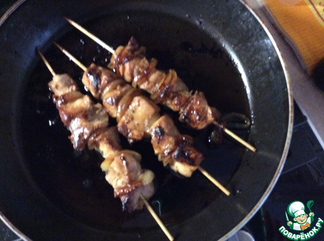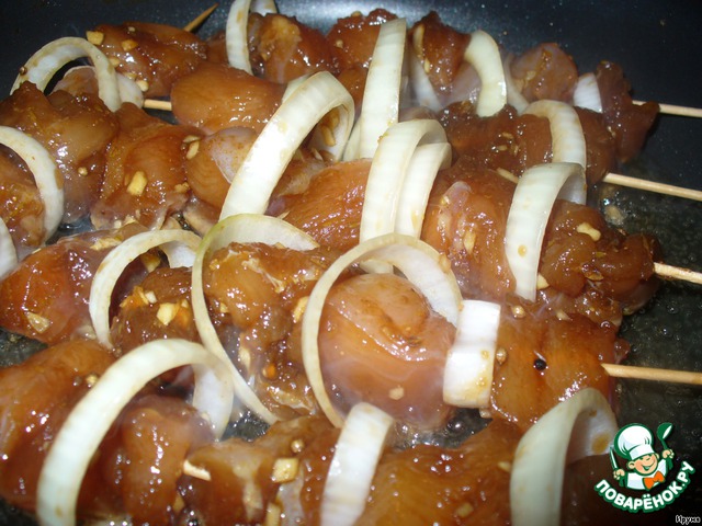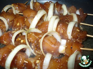 Деревянные шампуры для шашлыка замочить в холодной воде (чтобы к ним не прилипало мясо). Я на 15-20 минут примерно замачиваю. Лук очистить и нарезать кольцами, не очень тонкими. Нанизать на шампуры курицу попеременно с кольцами лука. Обжаривать на сковороде на масле 12-15 минут. Я люблю жарить их на большой тефлоновой сковороде. Переворачивать, чтобы шашлык обжарился равномерно со всех сторон.