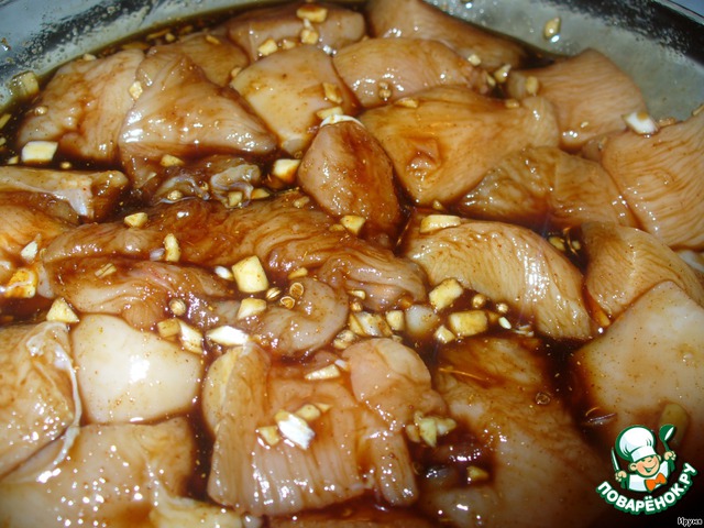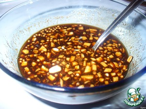 Приготовить маринад - смешать соевый соус с медом, лимонной цедрой, мелко рубленным или пропущенным через пресс чесноком, имбирем, паприкой и кориандром.