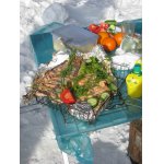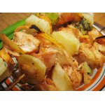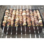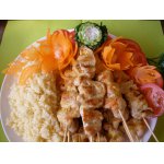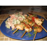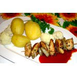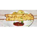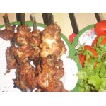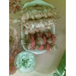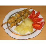 Наш шашлычок готов! Я его выкладываю на блюдо и подаю на стол. Гарнир может быть любой, либо его может и вовсе не быть. Я часто подаю с запеченной в духовке картошкой, которую подаю на отдельном блюде. Т. е. гости сами берут и картошку, и шашлык, кто сколько хочет - не надо раскладывать каждому в тарелку порционно. Мне такой вариант очень нравится.