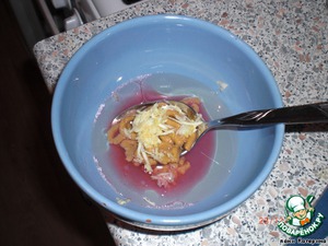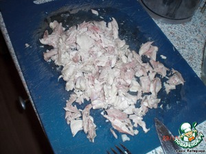 У меня было 3 бедрышка из которых я варила бульон, вот их и взяла, отделила мяско от костей и порезала опять-таки не очень мелко, на ощутимые кусочки.