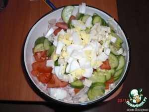 Яйцо (сваренное вкрутую) режем на кусочки и добавляем в салат. В принципе на этом я в салат перестала что-либо добавлять, остался только соус, но можно было еще сыр потереть (или порезать кубиками).