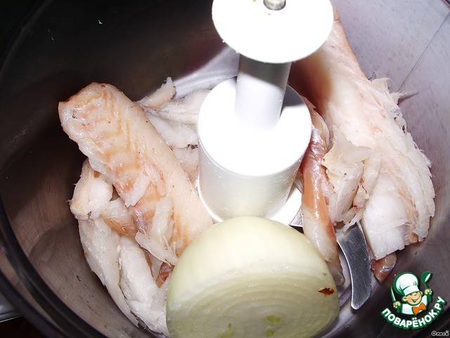 Все перемолоть с луком. Добавить масло, так как минтай - рыба суховатая.