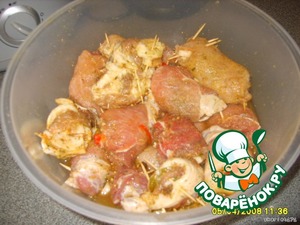 Любое мясо, какое есть в доме, отбить, посыпать любимыми специями, на середину выложить нарезанные соломкой маринованный огурец, морковь, лук, сладкий перец, завернуть рулетики, закрепить зубочистками и положить в маринад из-под огурцов, оставить на ночь