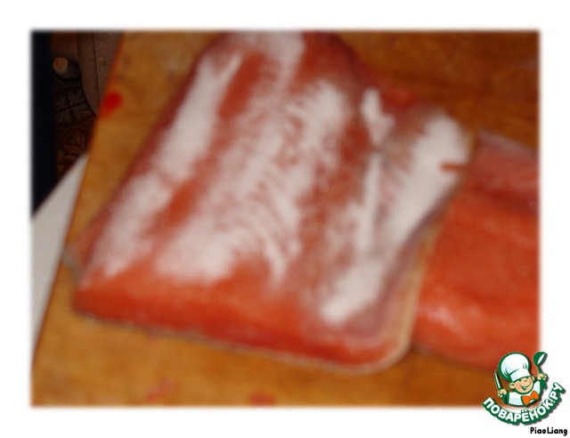 Разрезаем половины рыбы и щедро посыпаем солью. Могу только сказать, что на 1/4 рыбины уходит примерно 1-1,5 ч. л. соли (но можно чуть-чуть побольше).