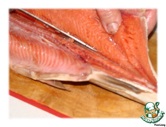Проделываем эту манипуляцию со всеми кусками, включая позвоночник, так как на нём остается много мяса рыбы. Мы всегда засаливаем позвоночник, поскольку я и папа - большие любители погрызть солёненькую рыбку. -
