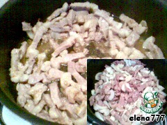 Затем смешать с порезанным луком и слегка обжарить на растительном масле. -
