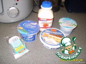 Творог, маскарпоне, сливки, ванильный сахар, сахар-песок.
