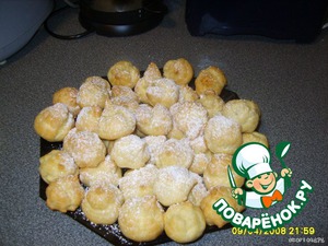 С помощью шприца выдавить на противень небольшие плюшки, оставляя промежутки между ними, выпечь при 175 градусах до золотистого цвета (духовку не открывать, тесто осядет)