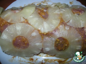 Ананас нарезать очень тонко (консервированный я разрезала пополам). Обложить мясо ломтиками ананаса