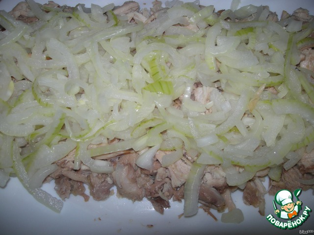 1 слой – куриное мясо, нарезанное кубиками;