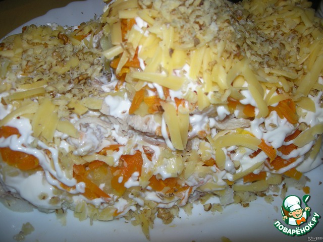 Все подготовленные ингредиенты выкладываем слоями на блюдо:
