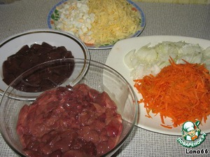 Печенку освободить от пленки и порезать на кубики. Муторный процесс, но стоит того. Печень мягче получается. Куриную печень использовала сразу, а вот говяжью замачивала в молоке на сутки.