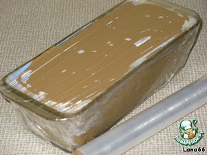 Форма заполнена. Теперь накрываем ее снова пищевой плёнкой и отправляем в холодильник. Желательно на ночь.