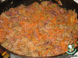 На сковороде потушить морковь с луком и печенкой, добавляя соли и немного воды. Тушить 5-7 минут под крышкой.
