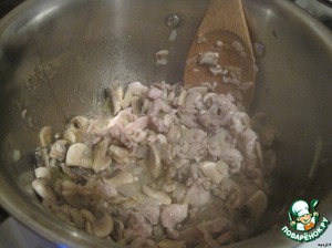 Нарезаем грибы и отправляем к курочке. Тушим.