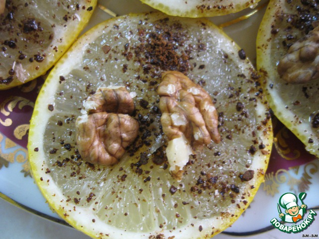 Лимончик моем, нарезаем кружочками, посыпаем сверху сахарком и свежемолотым кофе, сверху половинку (четвертинку) орешка.