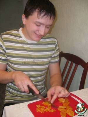 Курагу замочить на 15-20 минут. Слить воду и порезать брусочками.