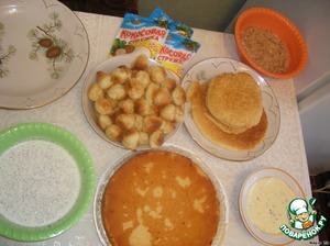 Ломаем песочные и готовые бисквитные коржи на куски разных размеров. В любом количестве добавляем крема. Скатываем из получившейся массы три кома разного размера! Каждый ком посыпаем кокосовой стружкой. Оформляем нашего снеговика!