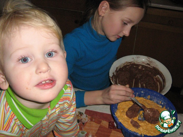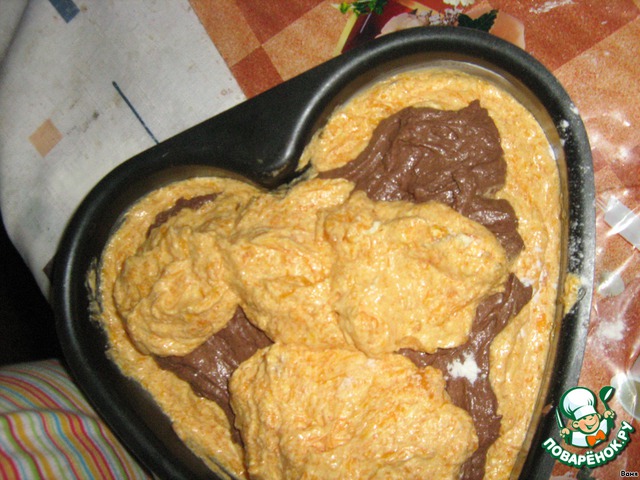 Выложить попеременно слой тыквенного теста, слой шоколадного. У меня вышло две формы по 4 слоя (тыква-шоколад-тыква -шоколад). Потом я пальчиком слегка поднимала нижний слой теста наверх для создания "мрамора".