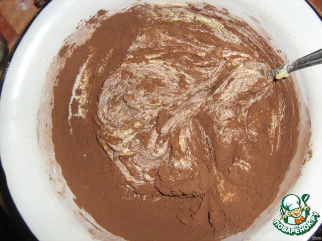 Оставшуюся половину муки, пекарского порошка, соли и какао смешиваем с оставшейся масляной смесью, муку и кефир добавляя попеременно. Начинать и заканчивать мукой. -