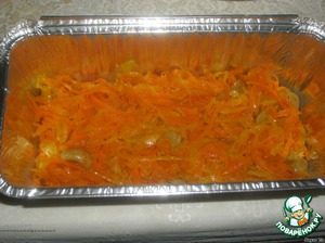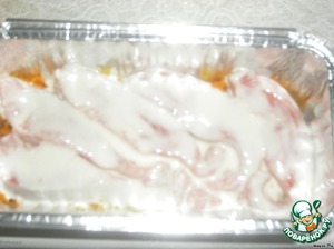 Обмакиваем рыбу в кляр и выкладываем сверху овощей, выливаем оставшийся кляр. Выкладываем оставшиеся овощи. Ставим в духовку на 30 минут при температуре 180 градусов.