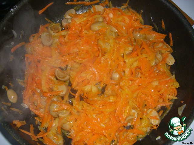 Лук режем тонкими полукольцами, морковь трём на крупной тёрке, шампиньоны режем пластиками. Обжариваем всё на масле. -