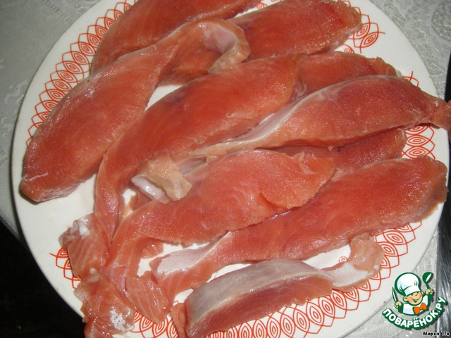 С рыбы снимаем шкуру, режем на кусочки. Солим и перчим.