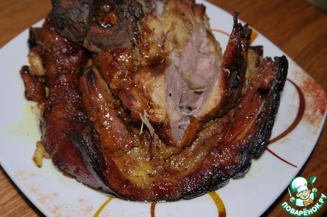 В 99 % рульку нужно мариновать на ночь и варить до готовности, прежде чем запекать... А у меня ну НЕТУТИ такой кастрюли, вот вывернулась, как смогла, причем результат - мягчайшее мяско, которое просто само отваливается от косточки... Это так несложно приготовить )))