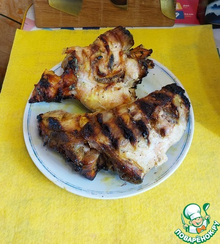 Готовим маринад: вымешиваем горчичку, майонез, специи, кукурму, мед, соль, перец, масло в однородную смесь, добавив пару раздавленных зубчиков чеснока...