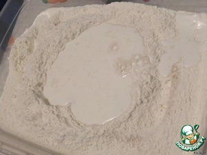 Итак.. высыпаем муку, делаем воронку посерединке, кидаем столовую ложку сахара, молочко теплое, дрожжи и замесить чего там с этого замесится... Оставляем на 15 мин... -