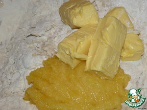 Желтки смешиваем с оставшимся сахаром, плюс 500 гр масла (100 гр оставим, чтобы растопить и смазать готовый кекс), добавляем в муку и вымешиваем ооочень тЧательно... фух.. упарилась...
