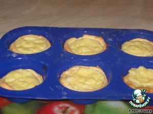 Готовое слоено-дрожжевое тесто раскатать слегка, вырезать чашкой кружочки и выложить в форму.