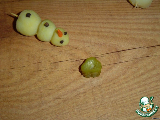 соединяем их с помощью зубочисток, глазки и пуговки оформляем гвоздикой, нос вырезаем из моркови, ведро - из соленого огурца.