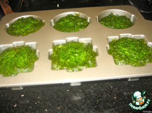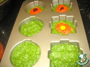 Теперь заполняем формочки: слой шпинатной кашицы, 1 ч. л. кашицы перца и в каждую я добавила по ягодке клюквы, а в одну кусочек желтого перца.