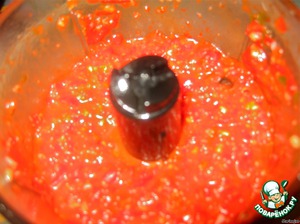 Красный болгарский перец с чесноком прокрутить в процессоре, заправить по вкусу и добавить 1 ложку муки (сода тут не нужна).