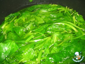 Отварить шпинат в подсоленной воде 1- 2 минуты, перекинуть на сито и сразу обдать холодной водой (для сохранения цвета).