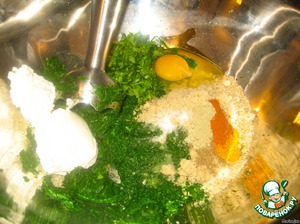 Добавить молотый орех, риккоту (или творог), сыр Филадельфия, яйца, мелко нарезанную кинзу и зеленый лук,на кончике ножа соду и 2 столовых ложек муки.