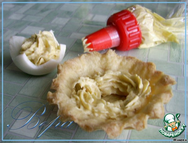 Выдавить массу в половинки яйца и в 4 тарталетки.