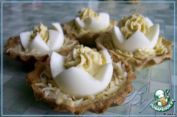 Выдавить массу в половинки яйца и в 4 тарталетки. -