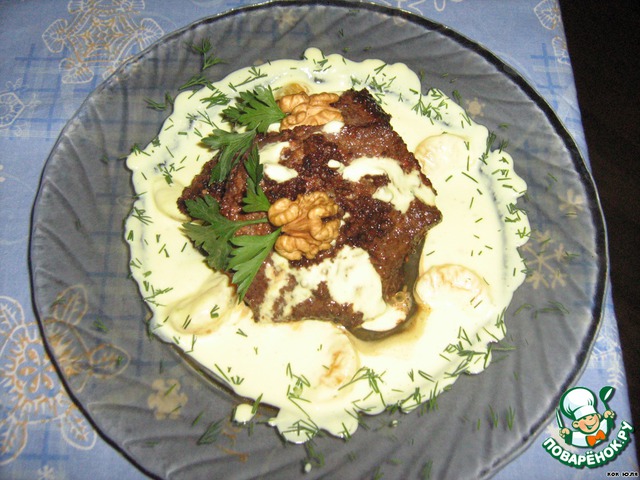 Мясо выкладываем на тарелку, вокруг наливаем соус,