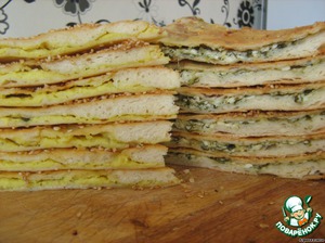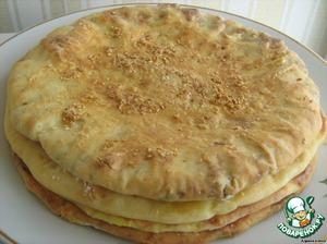 Выпекается сначала на нижней полке, потом на верхней при 180-200°C около 30 минут. Готовый пирог смазывают маслом и кунжутом. Складывается стопкой.