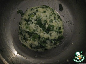 В это время готовим 1 - начинку. Соединяем тертые сыры + рубленая зелень, яйцо, перчим. Формируем 2 шара - убираем в холодильник.