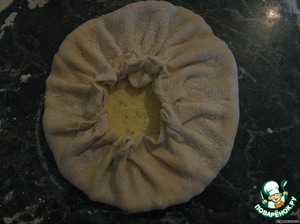 Готовое тесто делим на 4 одинаковых шарика. Раскатываем лепёшки. В середину выкладываем начинку. Приподнимаем края теста, соединяем их, чтобы начинка оказалась внутри. Руками разминаем тесто, придаём форму лепёшки. Скалкой раскатываем с двух сторон тонкий лист пирога.