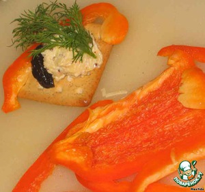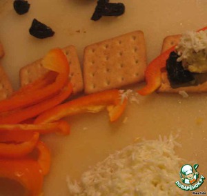 на хлебец (крекер) кладем сырный шарик, кусочек чернослива и перчик.. -