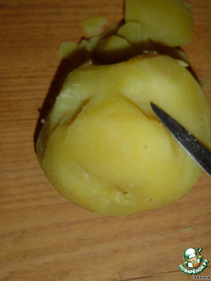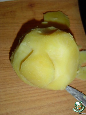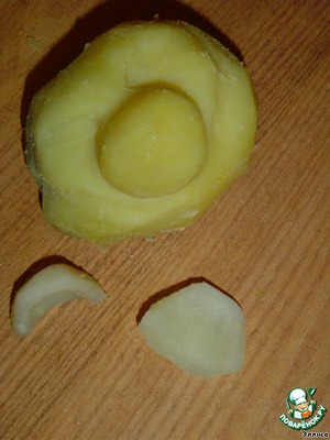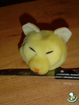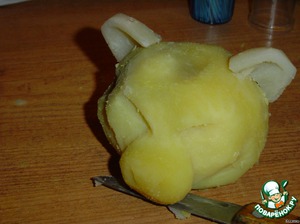 Вот пришло время для мордочки. Для этого отвариваем картофелину, очищаем и вырезаем так, как показано на пошаговых фото.