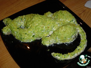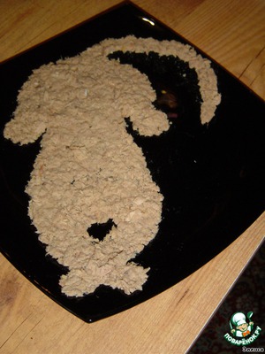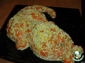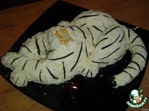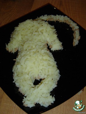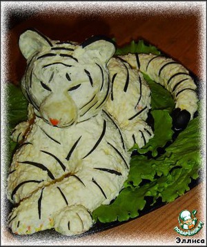 Теперь приступаем к сборке салата. Первым слоем выкладываем тунца в виде тела тигра.