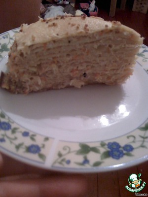 Отдельно жарим грибы, на оставшемся масле и добавляем к остальной начинке. В принципе масла можно взять меньше. Теперь собираем наш пирог. На смазанную маслом сковороду кладем один блинчик. Смазываем начинкой, накрываем следующим блинчиком, опять начинка, блинчик, начинка, блинчик и т.д. по желаемой высоте пирога.