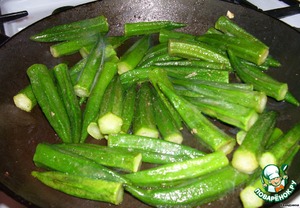 И отправляем на ту же скороводу, где до этого у нас обжаривалось мясо. Бамию, помешивая, обжариваем минут 5-7.