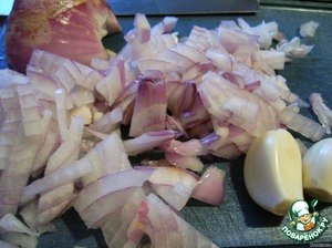Первым делом режем лук и чеснок - достаточно мелко (за кадром я рыдаю и даже кошка сидит с глазами, полными слез - уж очень лук попался злой), отправляем на сковородку с разогретым растительным маслом и обжариваем до золотистого цвета.