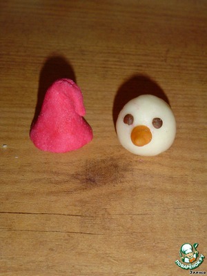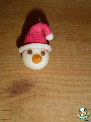 • надеваем колпачок на голову снеговика и делаем окантовку и бубенчик из белой мастики.